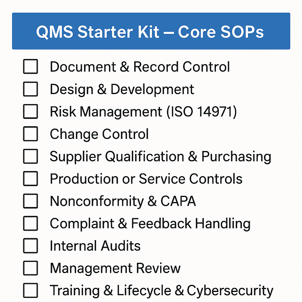 Certain elements are non-negotiable before any product ships: document and record control, design and development controls, risk management under ISO 14971, supplier and purchasing controls, production or servicing controls, CAPA, complaints and feedback, internal audits, and management review. Tackle these first, and you’ll have the backbone of a functioning QMS.