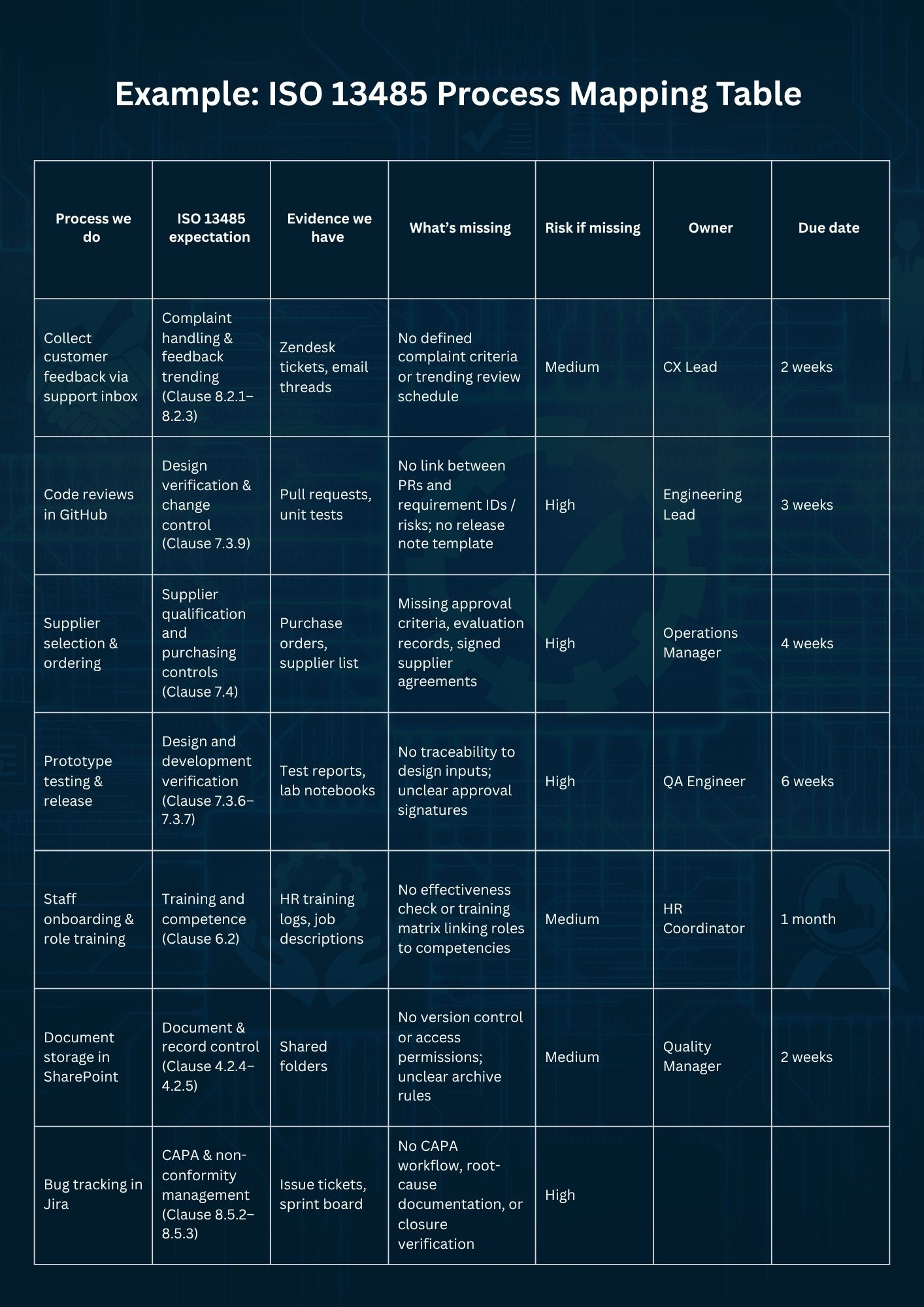 Each row represents a process you already perform, such as managing design changes or handling customer feedback. Across the columns, note what the ISO 13485 expectation is, what evidence you already have, what’s still missing, how risky that gap is (high, medium, or low), and who will close it by when.